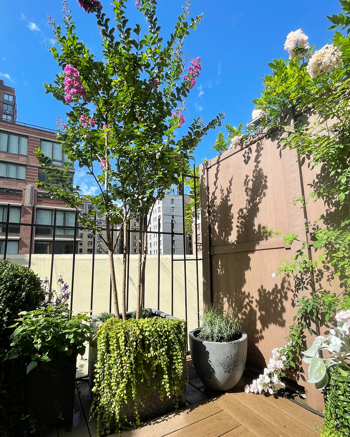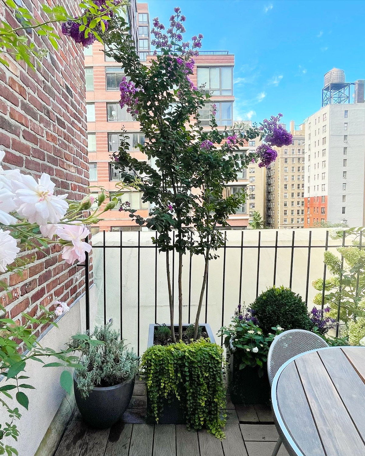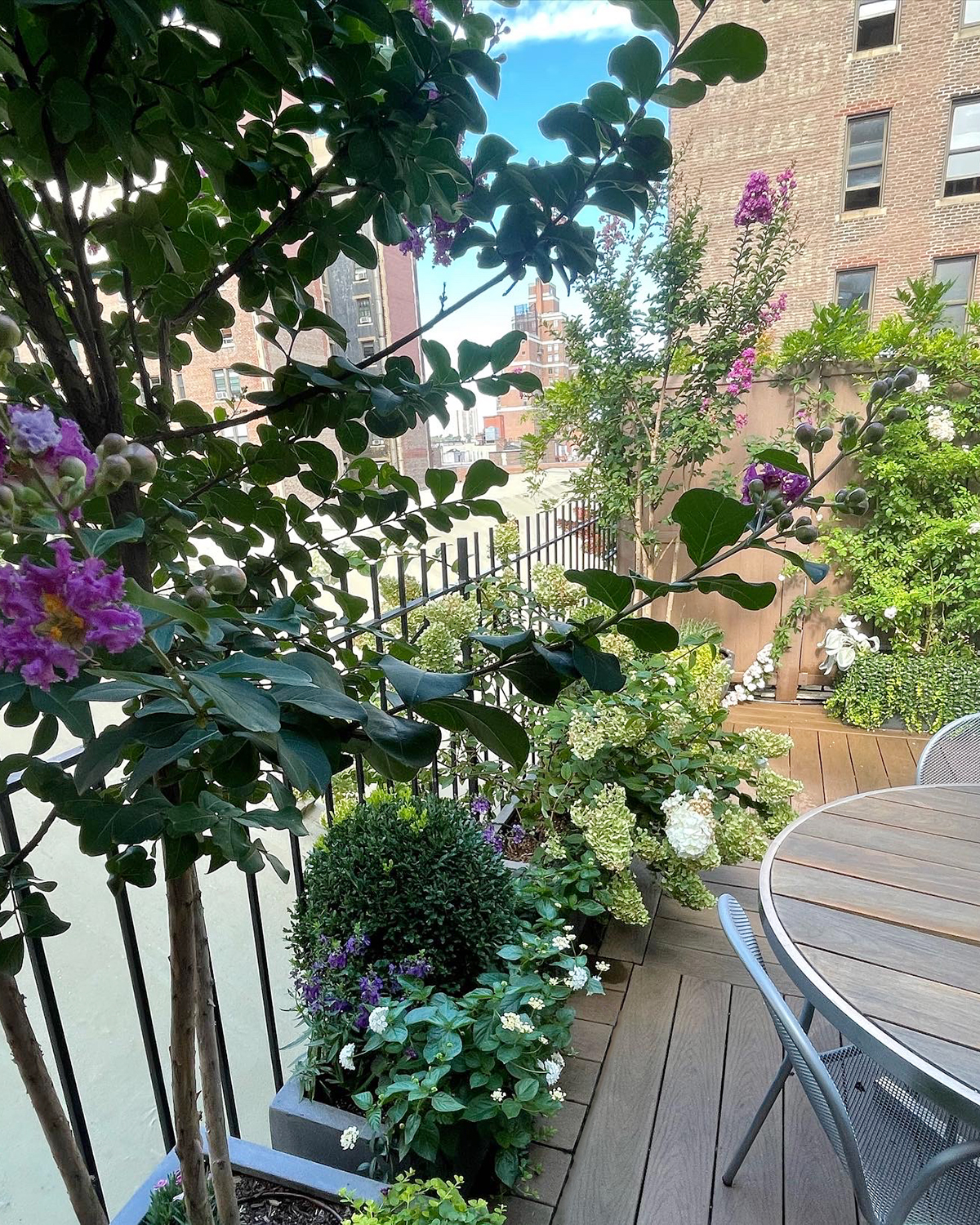The above photos show the state in which the patio garden was. The following two images show the work completed. The floor and walls were power washed. After the table was sanded; a clear coat of deck seal was used to seal the wood. Finally, new containers with sun-loving plants. Fresh soil, fertilizer, compost, and irrigation on a timer to keep the roots evenly watered at the right time. Plant material added, Climbing Miniature Rose, Crape Myrtle, Boxwood, Hydrangea, Stella D’oro Daylily, Lavender, Vinca vine, Creeping Jenny, and annuals.