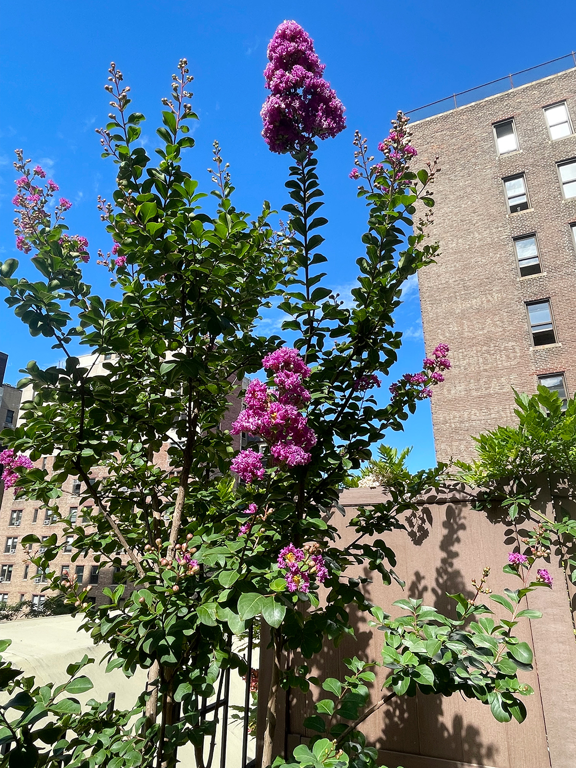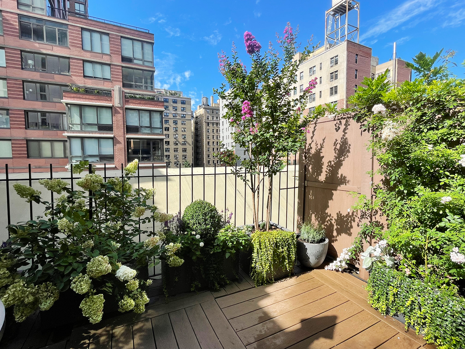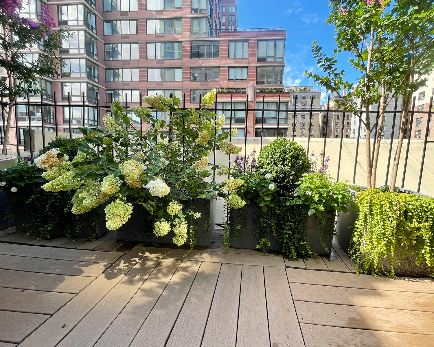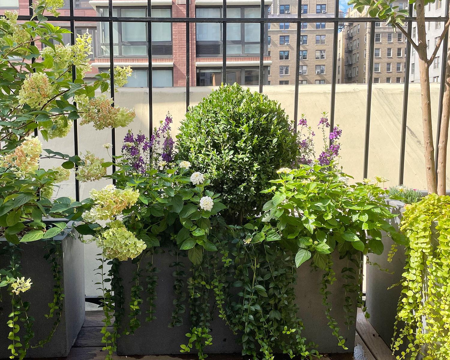 The above photos show the state in which the patio garden was. The following two images show the work completed. The floor and walls were power washed. After the table was sanded; a clear coat of deck seal was used to seal the wood. Finally, new containers with sun-loving plants. Fresh soil, fertilizer, compost, and irrigation on a timer to keep the roots evenly watered at the right time. Plant material added, Climbing Miniature Rose, Crape Myrtle, Boxwood, Hydrangea, Stella D’oro Daylily, Lavender, Vinca vine, Creeping Jenny, and annuals.