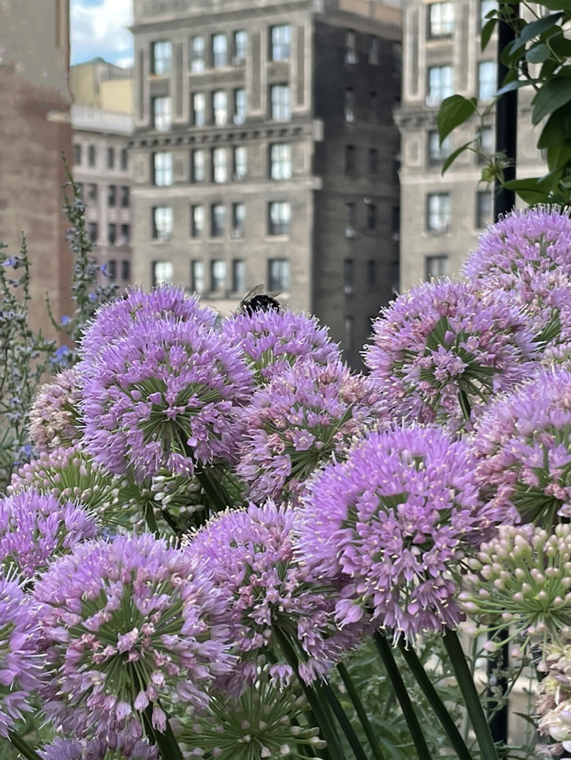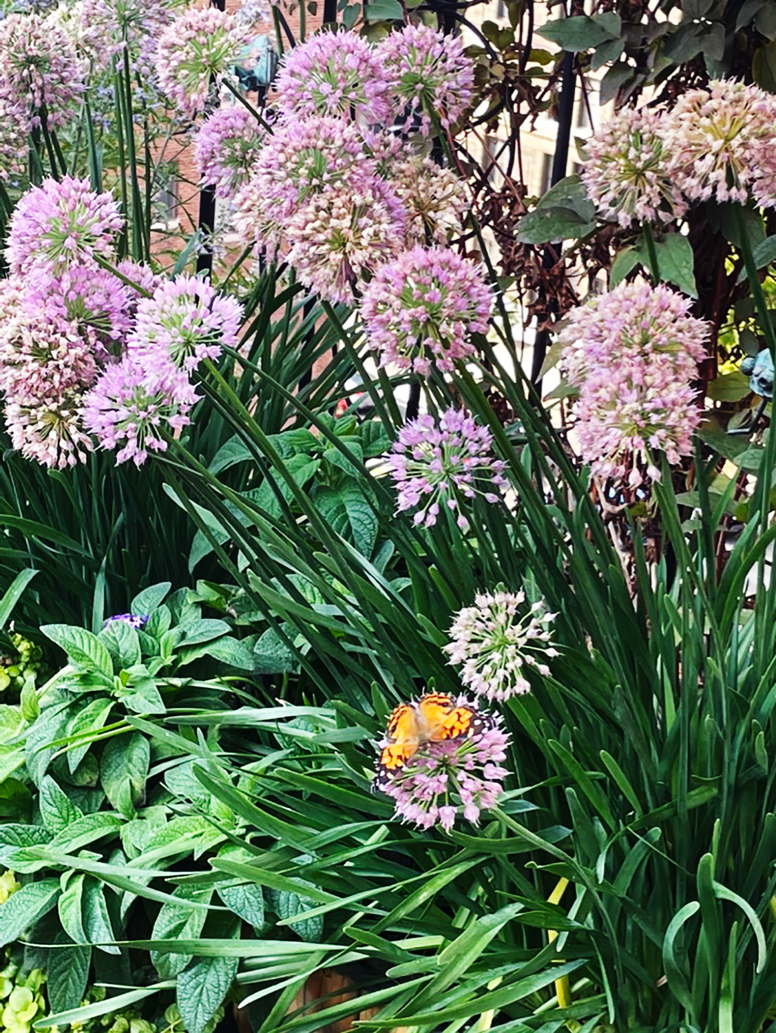 Certain colors are used to attract pollinators and butterflies. Here Alliums are used to attract honey bees and butterflies.