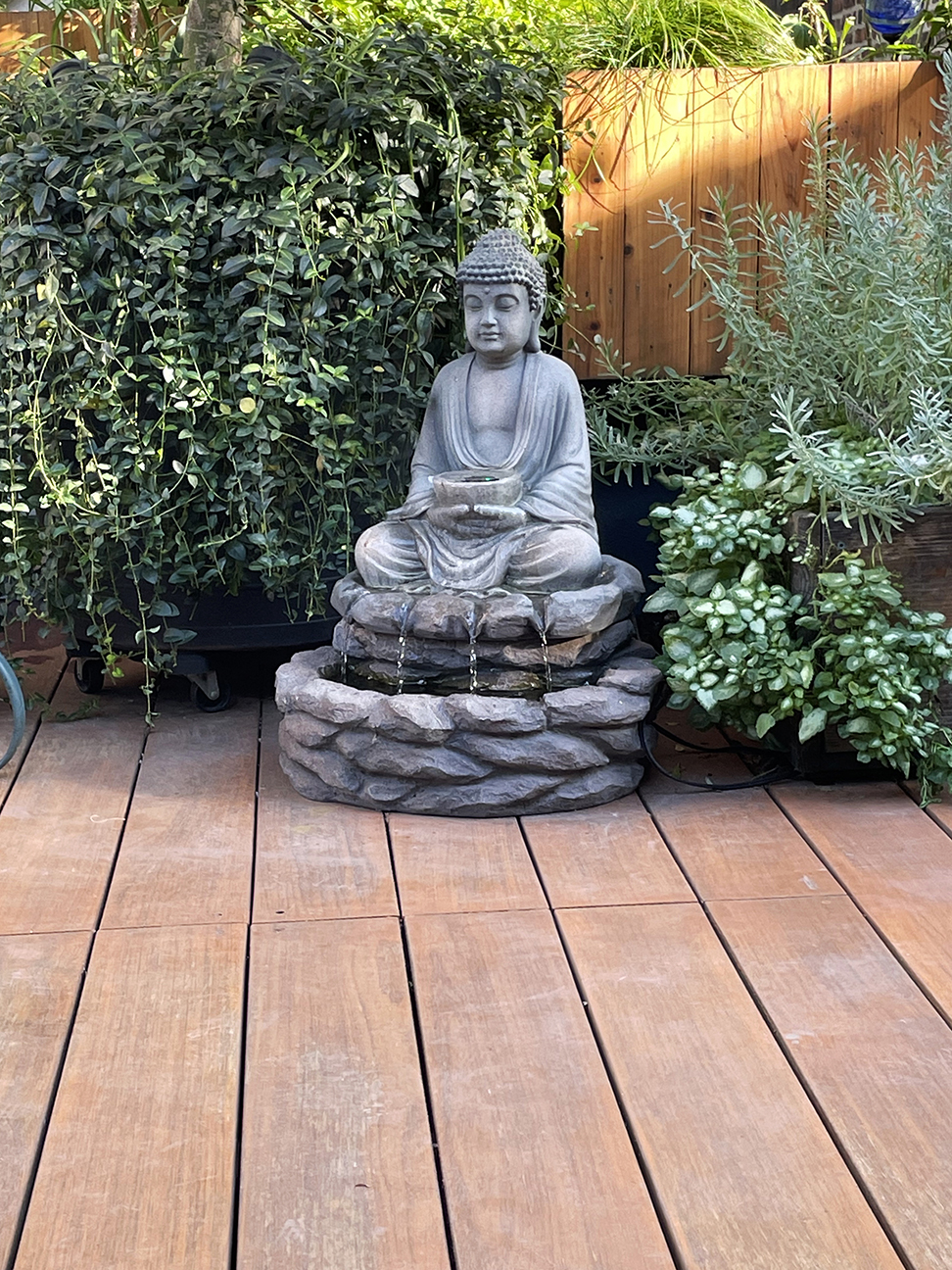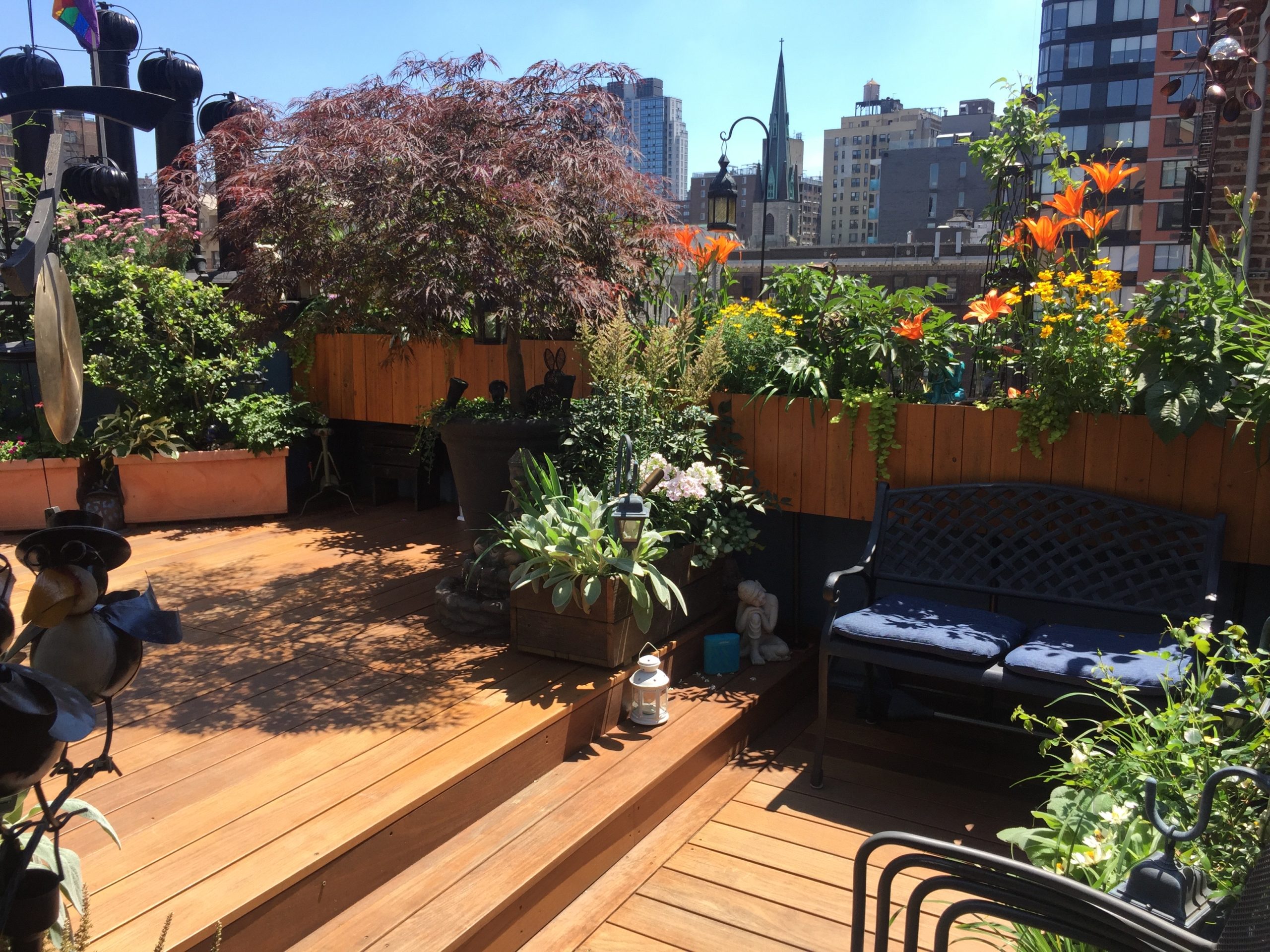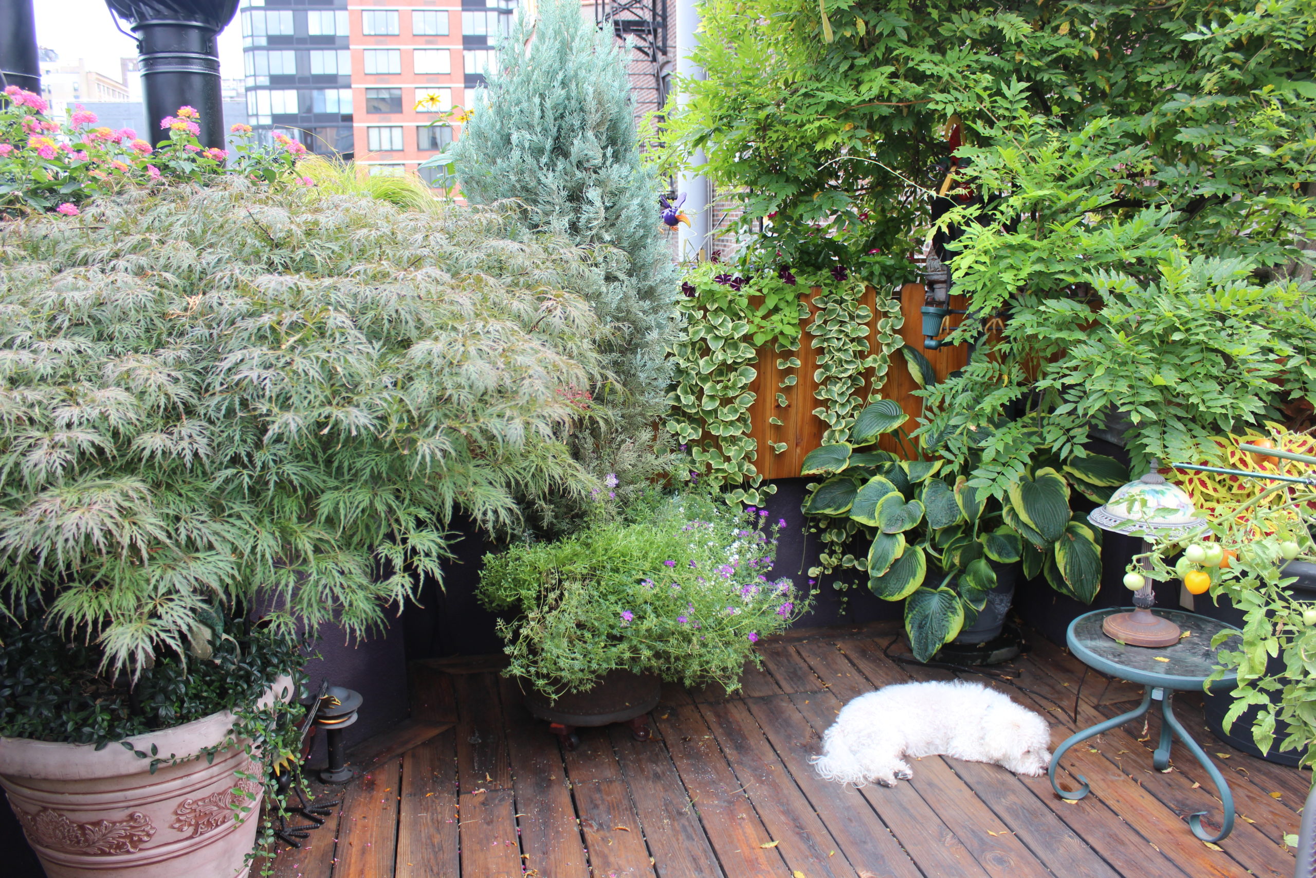 Above left and center photos, I use fountains and water features to attract birds and pollinators alike. In the picture on the right, I used a red Crape Myrtle tree to screen from an adjacent upcoming building. Something we can not get away from here in NYC.