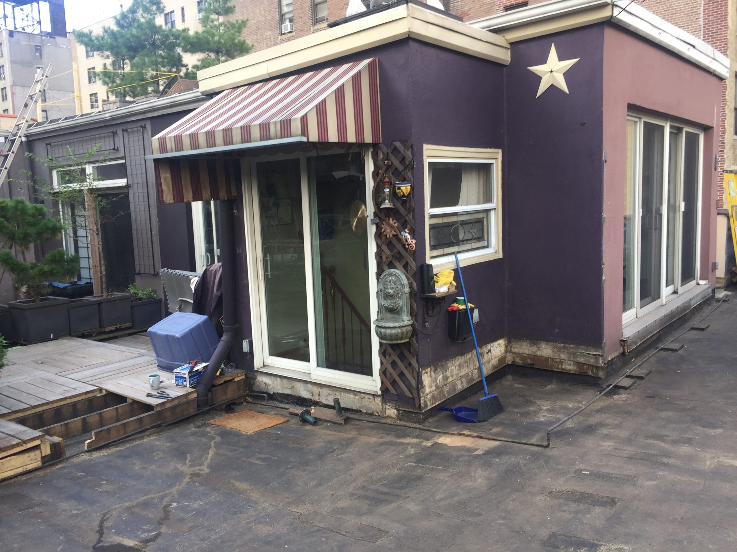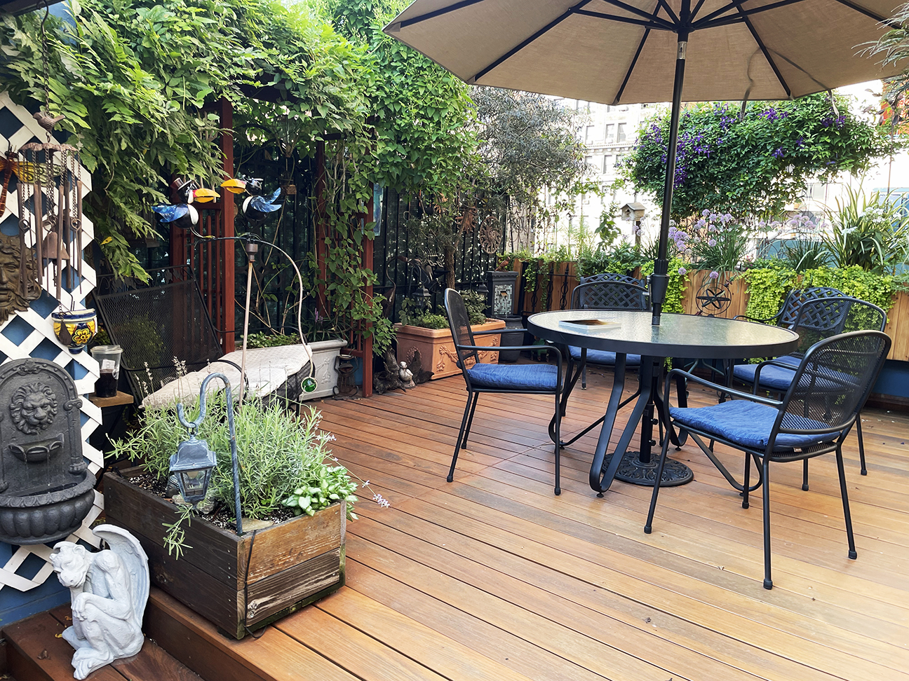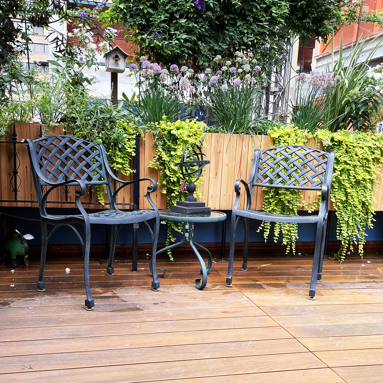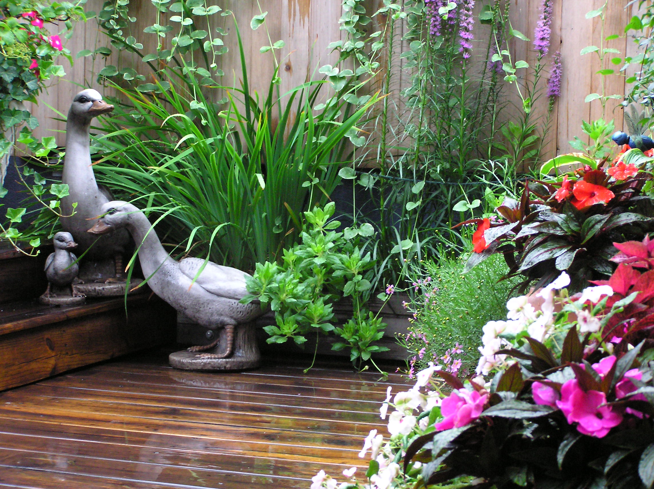 Above left and center photos, I use fountains and water features to attract birds and pollinators alike. In the picture on the right, I used a red Crape Myrtle tree to screen from an adjacent upcoming building. Something we can not get away from here in NYC.